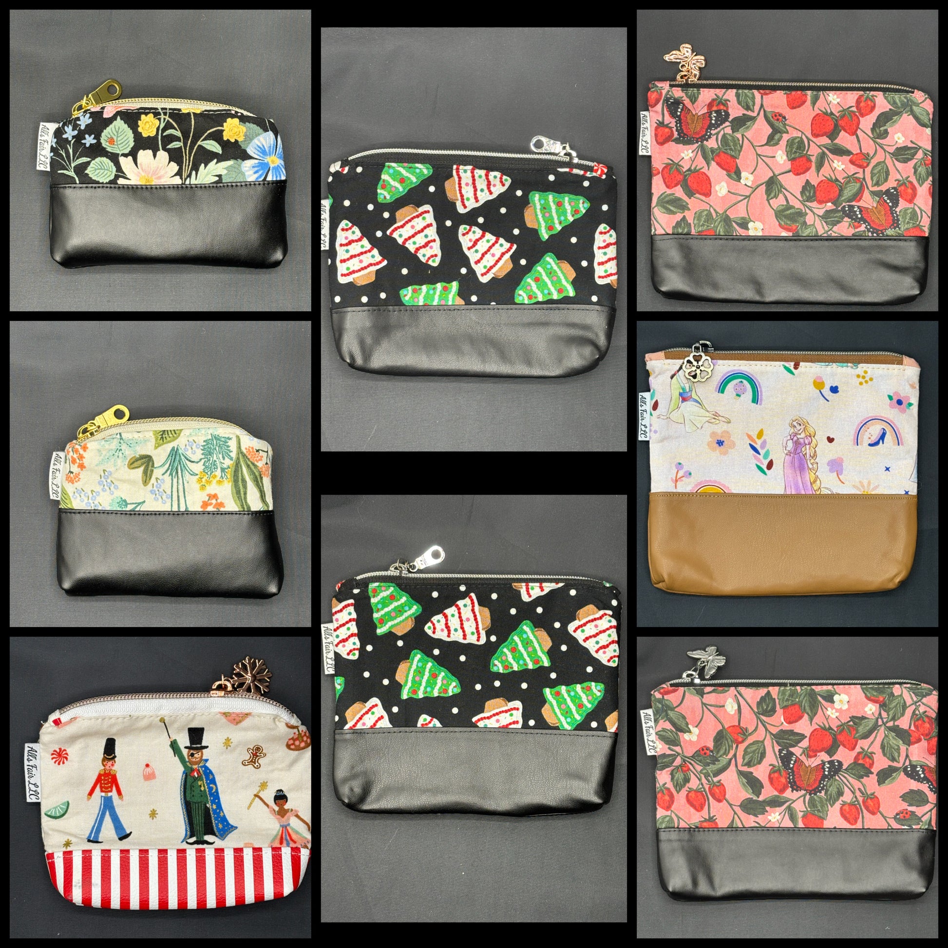 Christmas Tree Cake cotton fabric w/black faux leather, silver zippers, inside fabric is cotton with green and red peppermint candy: 7"Wx5"Hx1"D