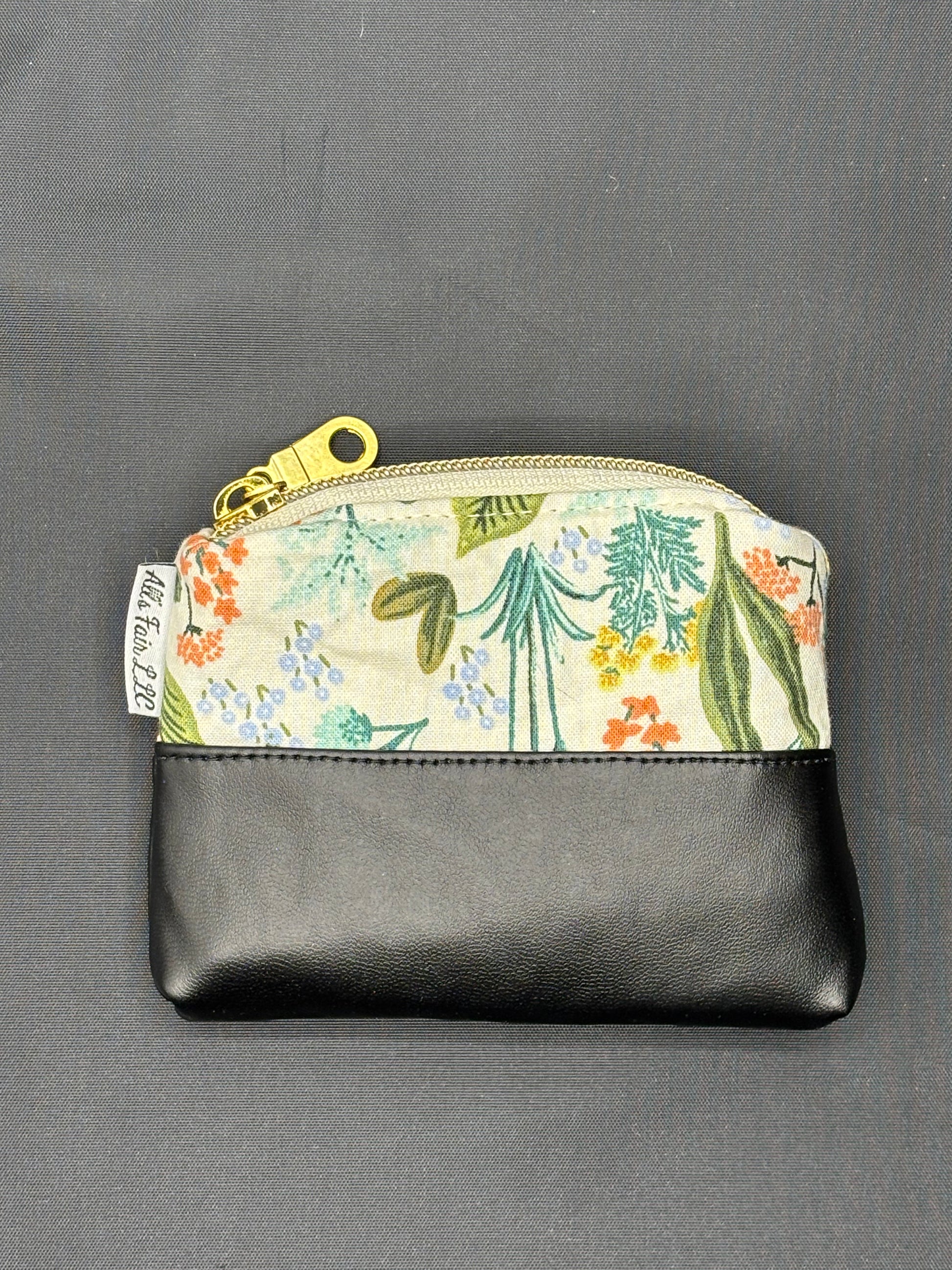 Dark Strawberry Fields RPC fabric w/black faux leather and gold zipper: 4.5"Wx3.25"Hx1/5"D